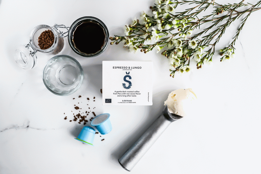 Fyrir einn 30 ml espresso frá Sjöstrand (1 espresso skot) 5 cl kaffilíkjör 2 cl vodka 1 kúla vanilluís Rifið dökkt súkkulaði