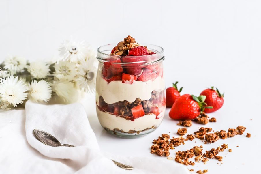 Dreifið 1-2 msk af haframulningi í botninn á krukku eða glasi. Því næst dreifið 2-3 msk af rjómaosta blöndunni og svo berjum eftir smekk. Dreifið aftur haframulningi, rjómaosta blöndunni og berjum. Skreytið með smá haframulningi og möndlu-og kókosmjöri