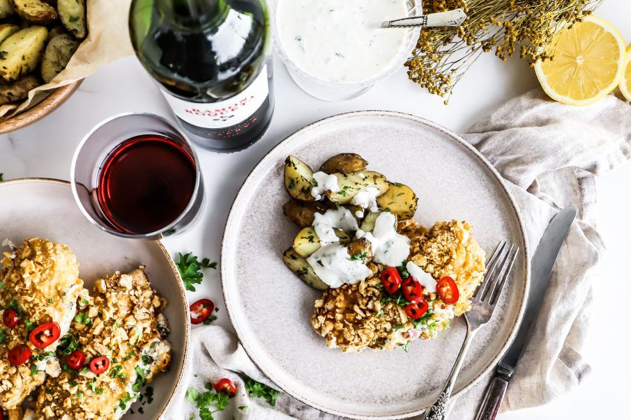 Fylltar kjúklingabringur með rjómaosti, chili og sítrónu bornar fram með kartöflubátum og hvítlaukssósu. Það passar líka sérlega vel að bera þær fram með góðu salati. Ég elska fylltar kjúklingabringur! Þær verða eitthvað svo extra djúsí og góðar. Ég notaði svo Linsubauna snakk með chili og sítrónu frá Eat real til að fá kröns utan um kjúklinginn og vá hvað það passaði vel.