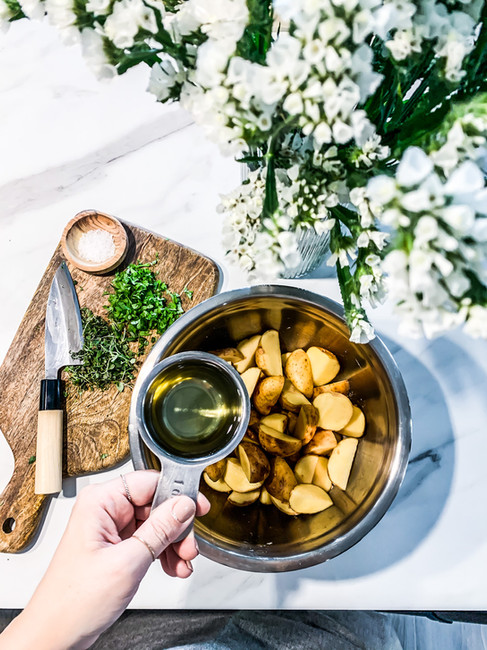Kartöflur 10 kartöflur ½ dl ólífuolía 1-2 msk ferskt timian (má vera þurrkað) 1-2 msk fersk steinselja Salt & pipar