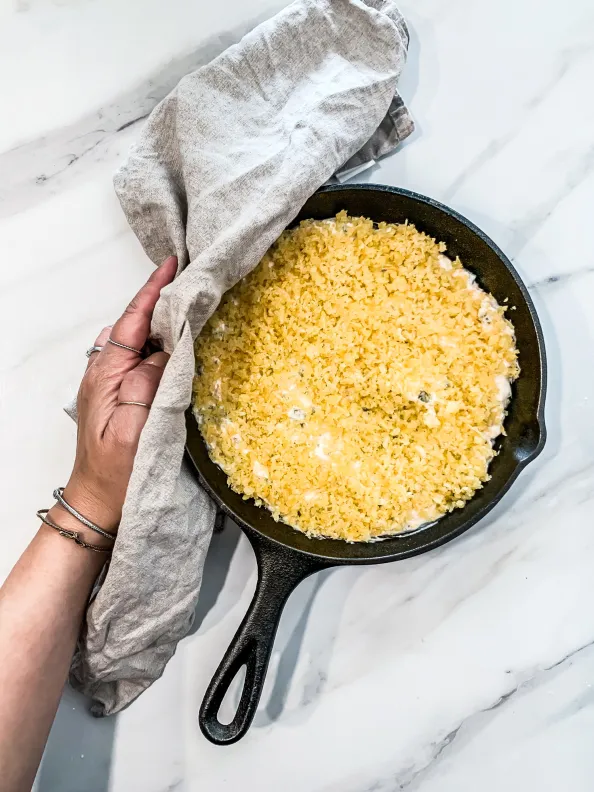 Dreifið raspinum yfir ídýfuna og bakið í ofni við 190°C á blæstri í 20 mínútur eða þar til ídýfan er orðin gyllt og stökk. Það er einnig mjög gott að grilla ídýfuna.