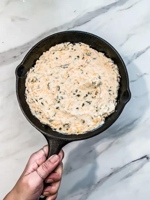 Blandið saman rjómaosti, sýrðum rjóma, cheddar osti, parmigiano og jalapeno. Dreifið blöndunni í eldfast mót eða steypu járnspönnu.