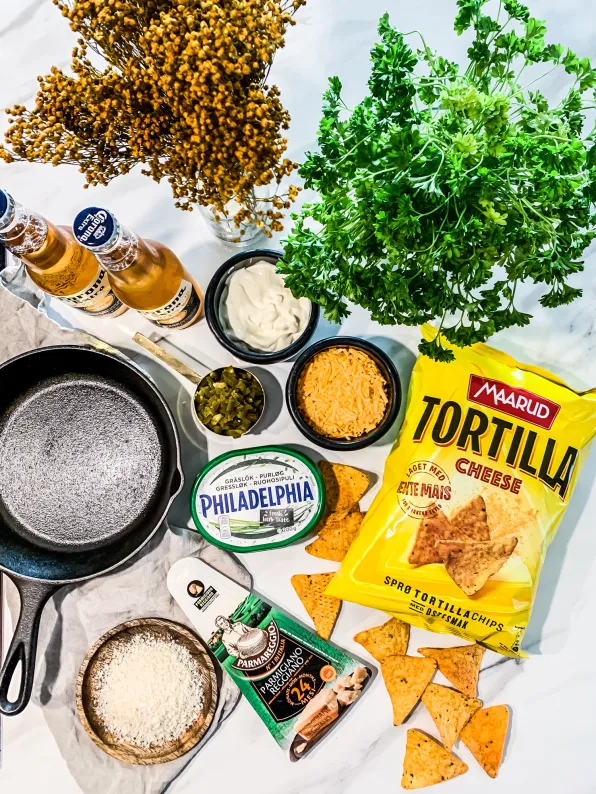 Gómsæt ostaídýfa sem inniheldur Philadelphia rjómaost með graslauk, sýrðan rjóma, parmigiano reggiano, jalapeno og cheddar ost! Svakalega góð og passar sérlega vel með köldum drykk og tortillaflögum á sólardögum eða sem snarl á kósýkvöldi með uppáhalds þættinum ykkar. Ég mæli með að bæta við jalapeno eftir smekk, fer eftir því hversu sterkt þið viljið hafa þetta. Svo er algjör snilld að setja ídýfuna á grillið í ferðalögum, þá er gott að nota steypujárnspönnu eða annað ílát sem má fara á grill.