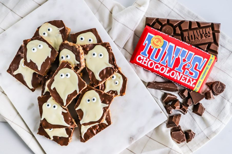 Ljúffengt hrekkjavökusælgæti sem inniheldur rice krispies, Tony’s mjólkursúkkulaði, hnetusmjör, síróp og skreytt með hvít súkkulaði draugum. Ég útbjó þessa uppskrift í samstarfi við Innnes þar sem ég nota bragðgóða Tony’s súkkulaðið í uppskriftina. Súkkulaðinu sjálfu er skipt í ójafna parta en það er gert til að endurspegla misréttið sem á sér stað við framleiðslu kakóbauna sem er svo algengt í dag. Markmiðið hjá Tony’s er að framleiða gæða súkkulaði algerlega án þrælkunar. Svo nú er bara að bretta upp ermarnar og útbúa nammibita úr þessu geggjaða súkkulaði. Þessa sniðugu hugmynd sá ég á samfélagsmiðlum og það er upplagt að gera þetta með börnunum.