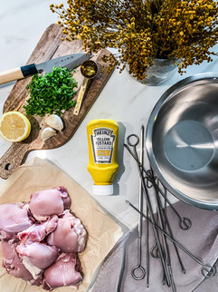 Fyrir 3-4 Kjúklingaspjót 6-7 spjót 6-7 úrbeinuð kjúklingalæri 1-2 msk Heinz sinnep mild Safi úr ½ sítrónu 3 msk ólífuolía 2 hvíltauksrif, pressuð 2-3 msk steinselja, smátt söxuð Salt og pipar