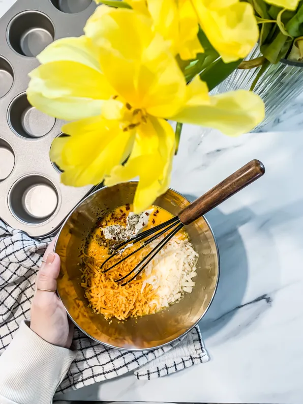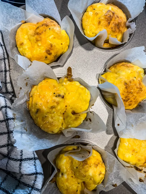 Dreifið eggjablöndunni jafnt í formin og stráið smá cheddar osti yfir.