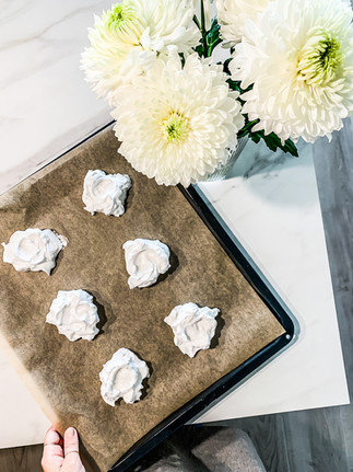 Mótið pavlovurnar með tveimur skeiðum í tíu kökur og dreifið á tvær ofnplötur þaktar bökunarpappír.