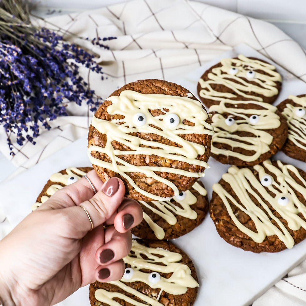 Einstaklega bragðgóðar og krúttlegar hrekkjavöku smákökur sem innihalda Milka Oreo súkkulaði ásamt hvítu súkkulaði. Tilvalið að útbúa með börnunum um helgina. Svo er einnig sniðugt að skella í þær fyrir jólin og þá er hægt að sleppa augunum og jafnvel gera þær minni.