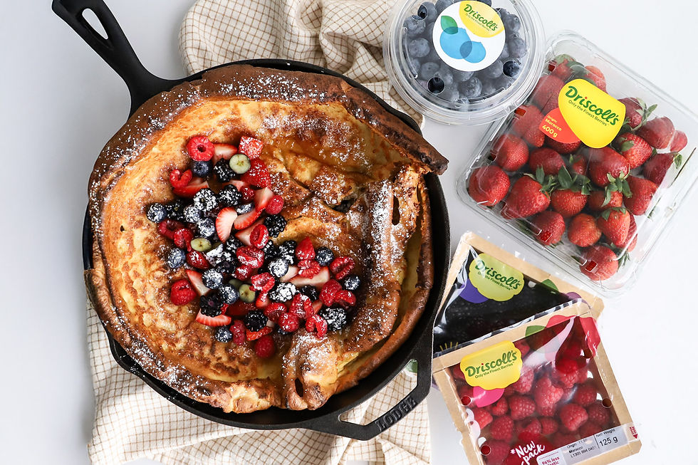 Ofnbökuð pönnukaka eða Dutch Baby Pancake með nóg af berujum er fullkomið fyrir helgarbrönsinn þegar ykkur langar í eitthvað extra gott. Stór mjúk pönnukaka sem er létt og góð þegar hún lyftist í ofninum. Berið fram með ferskum Driscoll’s berjum, smjöri, flórsykri og sírópi. Auðvelt og fljótlegt að framkvæma. Deigið blandast á nokkrum mínútum og restin sér um sig!