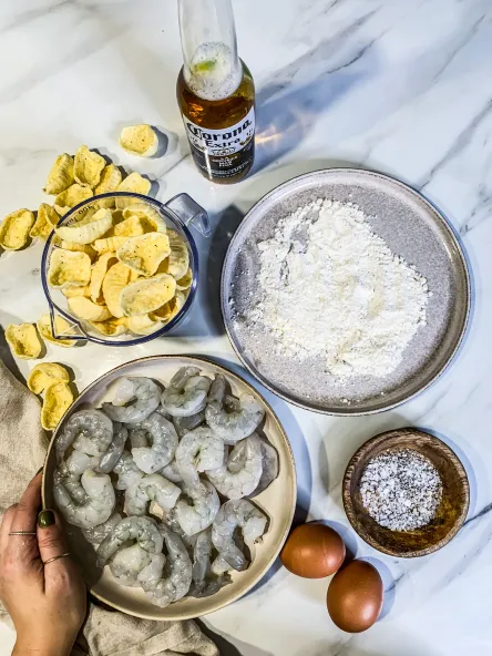 Veltið tígrisrækjunum upp úr ólífuolíu og kryddið með salti og pipar. Næst veltið þeim upp úr speltinu, egginu og að lokum snakkinu. Mér finnst gott að nota tangir.