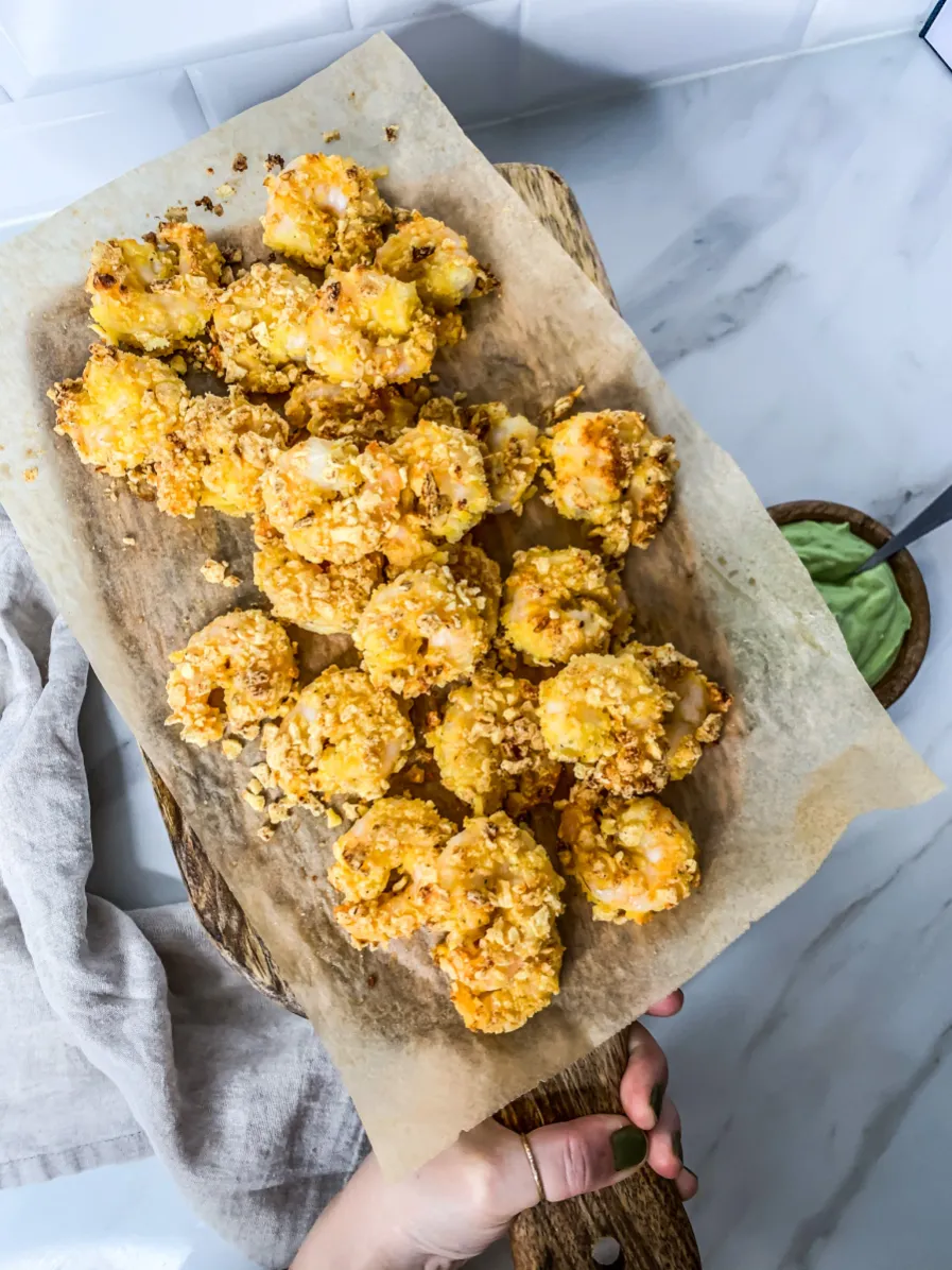 Uppskrift að afar góðum risarækjum í snakk krönsi sem eru bornar fram með avókadó sósu með dilli og sýrðum rjóma. Tilvalið sem aðeins öðruvísi forréttur eða léttur réttur yfir hátíðarnar. Ég þakti rækjurnar með hummus snakki frá Eat real með dill bragði sem passar sérlega vel með risarækjunum. Snakkið er gert úr kjúklingabaunum og er einnig ótrúlega gott eitt og sér. Það er vegan, glúten frítt og 40% fituminna en venjulegt snakk.