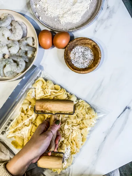 Setjið snakkið í poka og rúllið yfir með kökukefli svo það verði að mulningi.