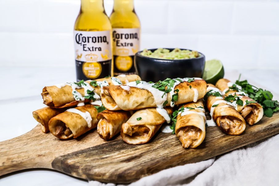 Stökkt taquitos með mjúkri kjúklinga- og ostafyllingu borið fram með guacamole og kóríander sósu. Nammii, þetta er alltof gott! Ef að þið viljið gera uppskriftina ennþá fljótlegri þá er sniðugt að kaupa tilbúna kryddblöndu í staðinn fyrir kryddin á kjúklinginn og skipta kóríander sósunni út fyrir sýrðan rjóma.