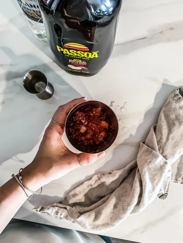 Hellið passoa, rommi, trönuberjasafa og klaka í kokteilahristara og hristið vel í ca. 15 sekúndur.